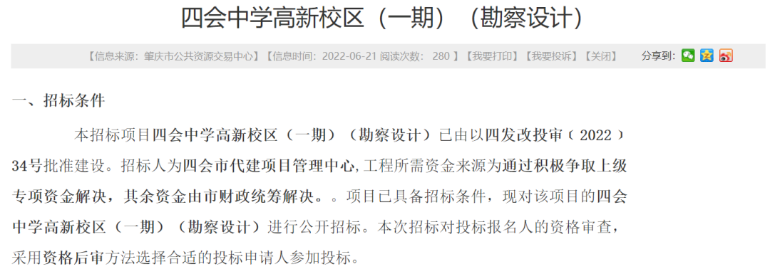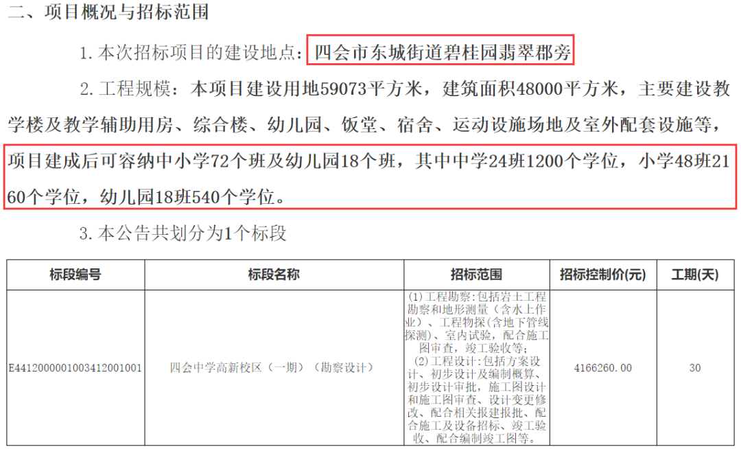 6月21日,肇庆公共资源交易中心发布四会中学高新校区(一期)勘察设计招标公告,这意味着,该学校即将进入施工阶段。
