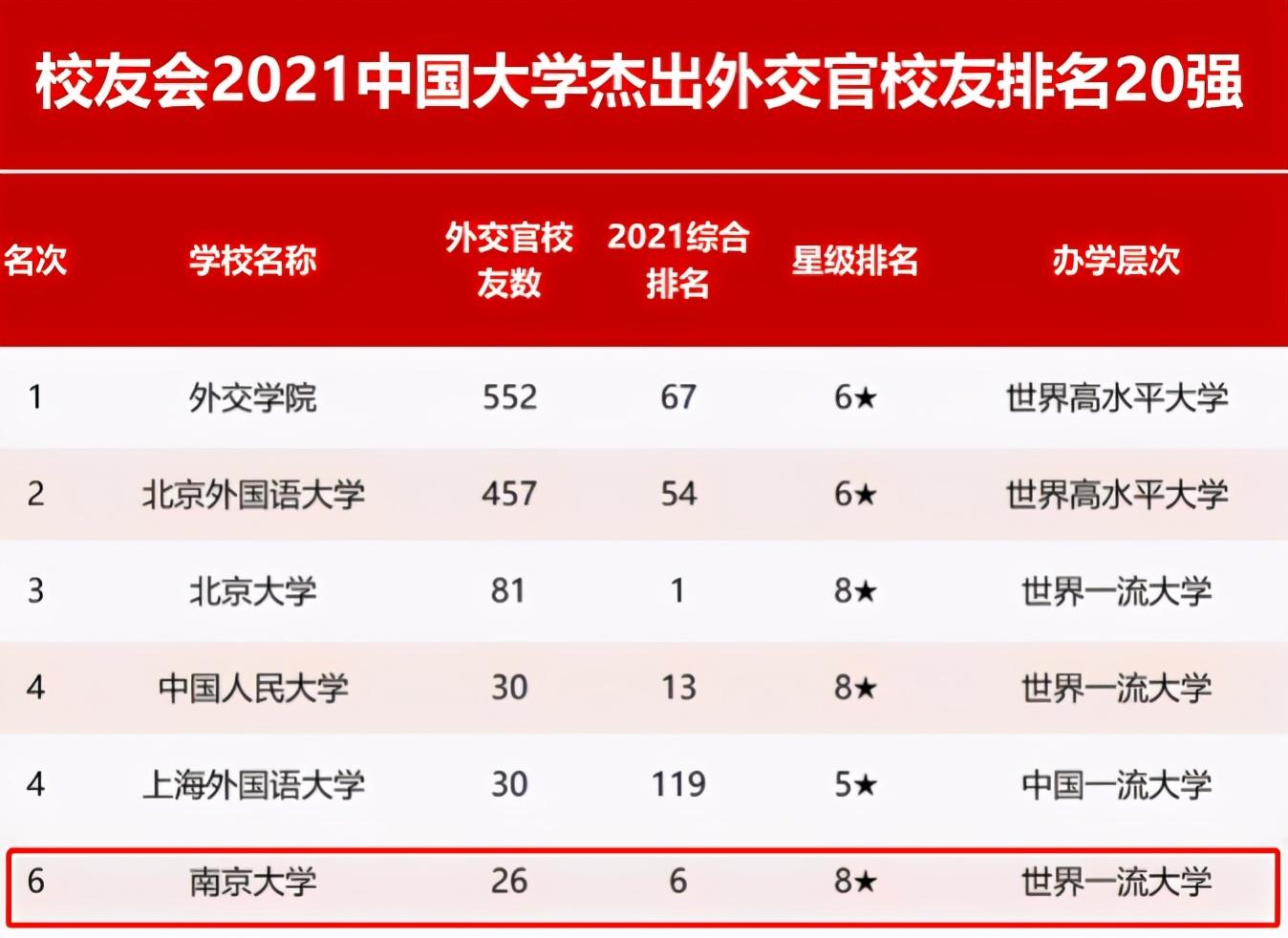 校友会2021中国大学杰出外交官校友排名,南京大学以培养造就了26位中国驻外大使、驻外总领事和外交部新闻发言人等杰出校友,位居全国第6;