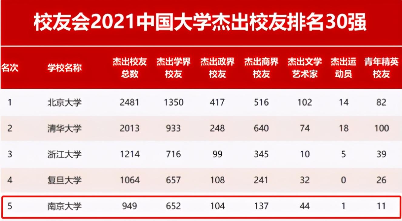 2021年4月26日,校友会发布2021中国大学杰出校友排名,南京大学以培育出949位杰出校友的总数位居全国第5;