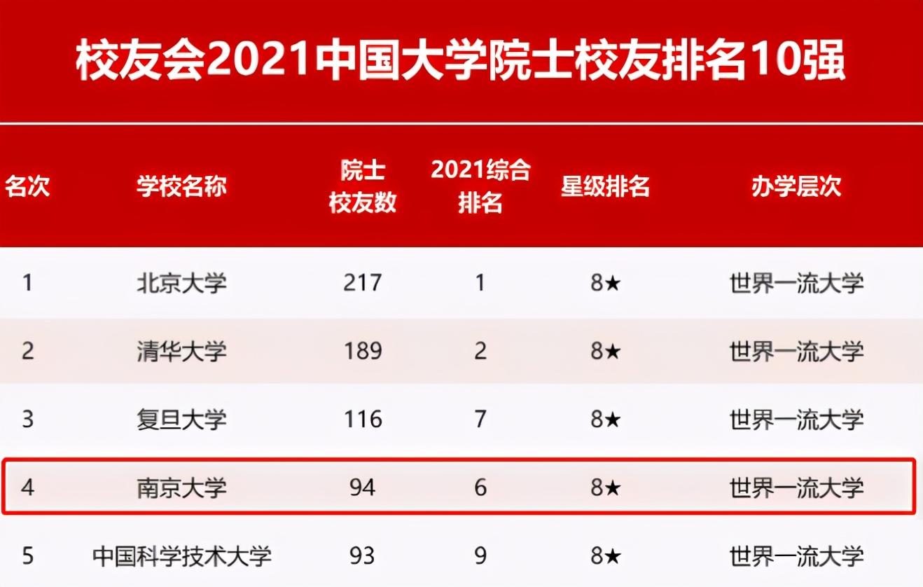 校友会2021中国大学院士校友排名,南京大学以培养造就94名中国两院院士和国际院士,位居全国第4;