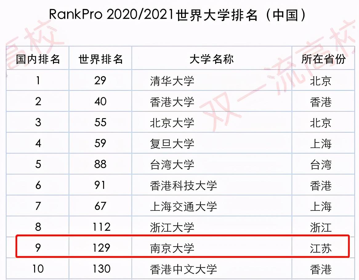 2021年5月,RankPro2020/2021最新版的世界大学排名发布,南京大学位居中国大陆高校第6位;
