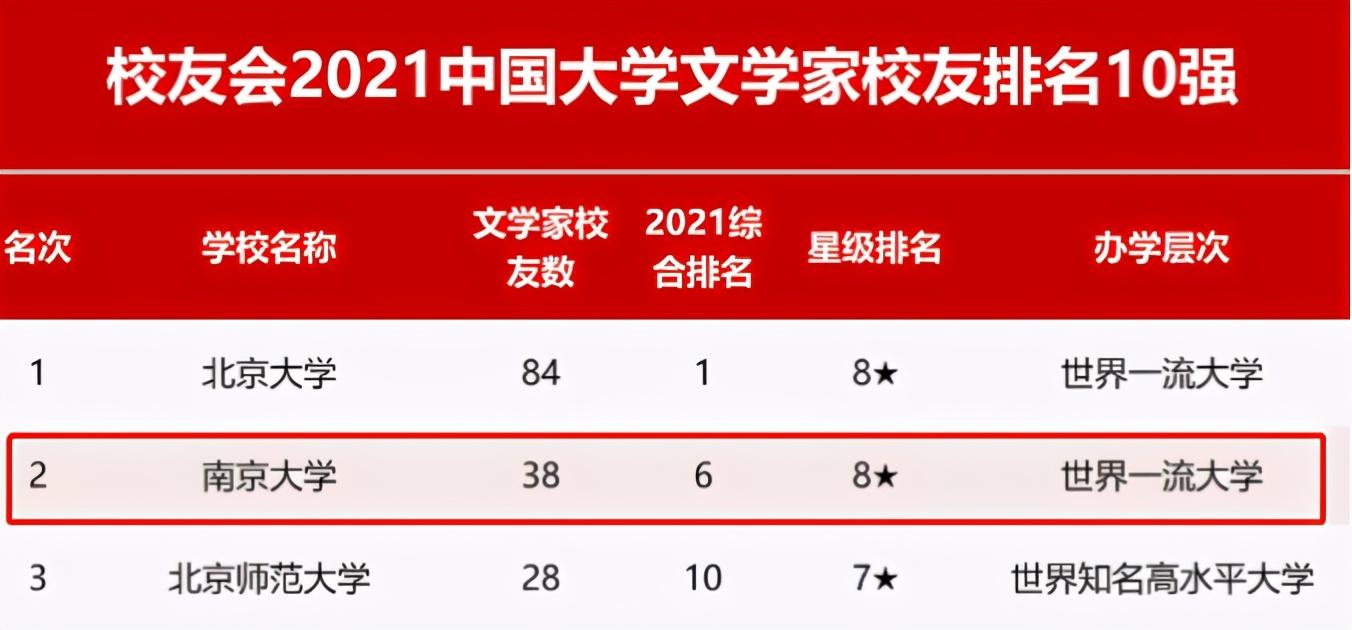 校友会2021中国大学文学家校友排名,南京大学以培养造就了38位中国杰出文学创作人才,位居全国第2。