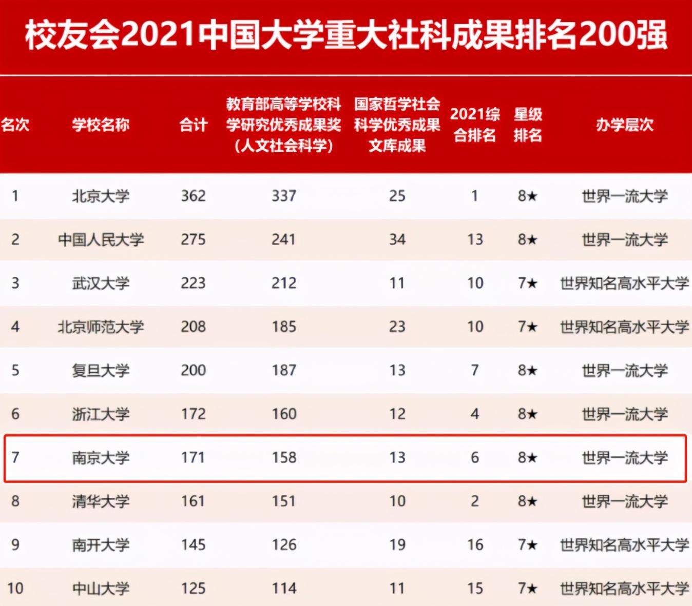 在“2021中国大学重大社科成果排名”中,南京大学位居全国第7;