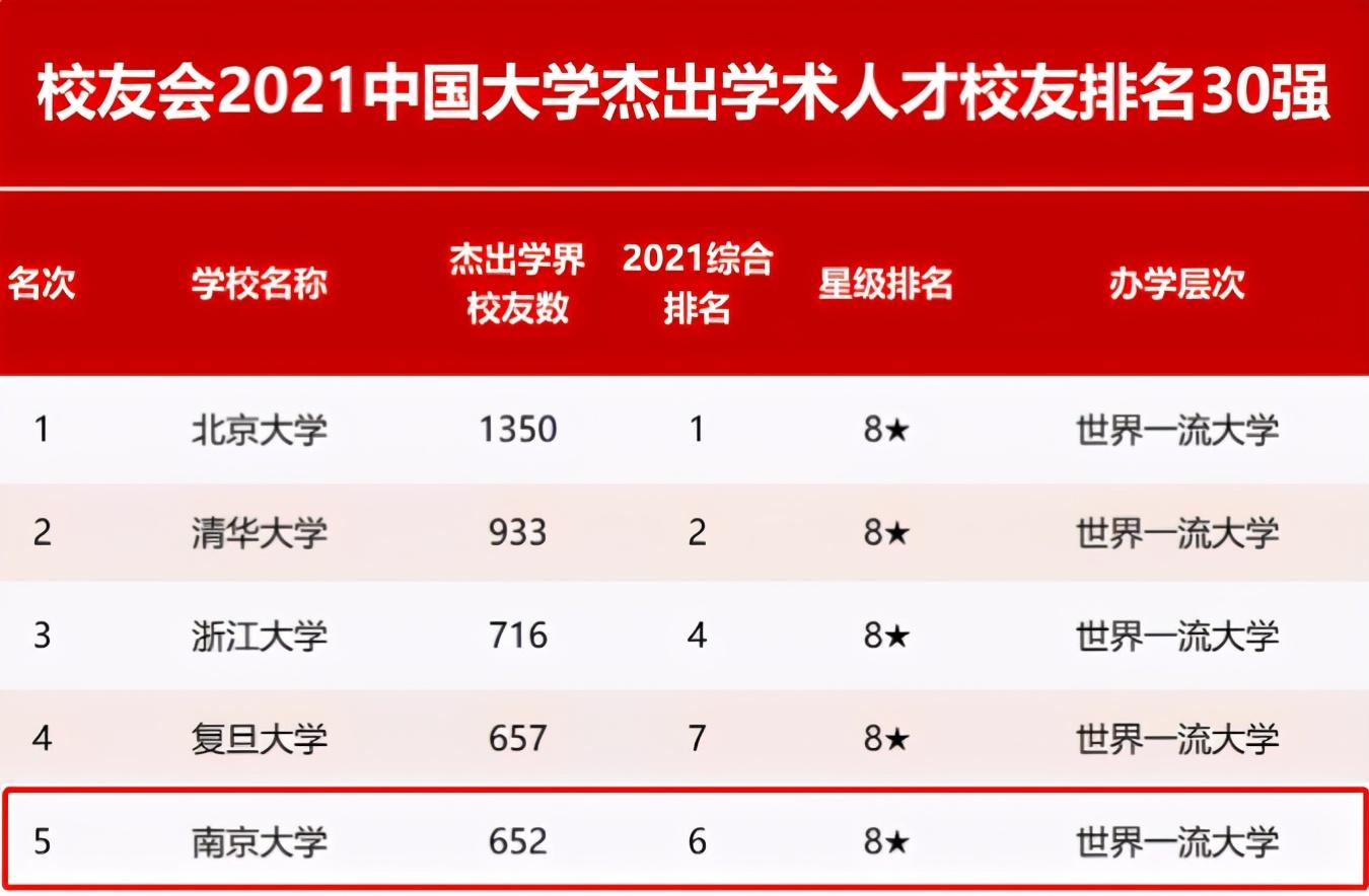 校友会2021中国大学杰出学术人才校友排名,南京大学以培养造就了652名中国杰出学术人才,位居全国第5;