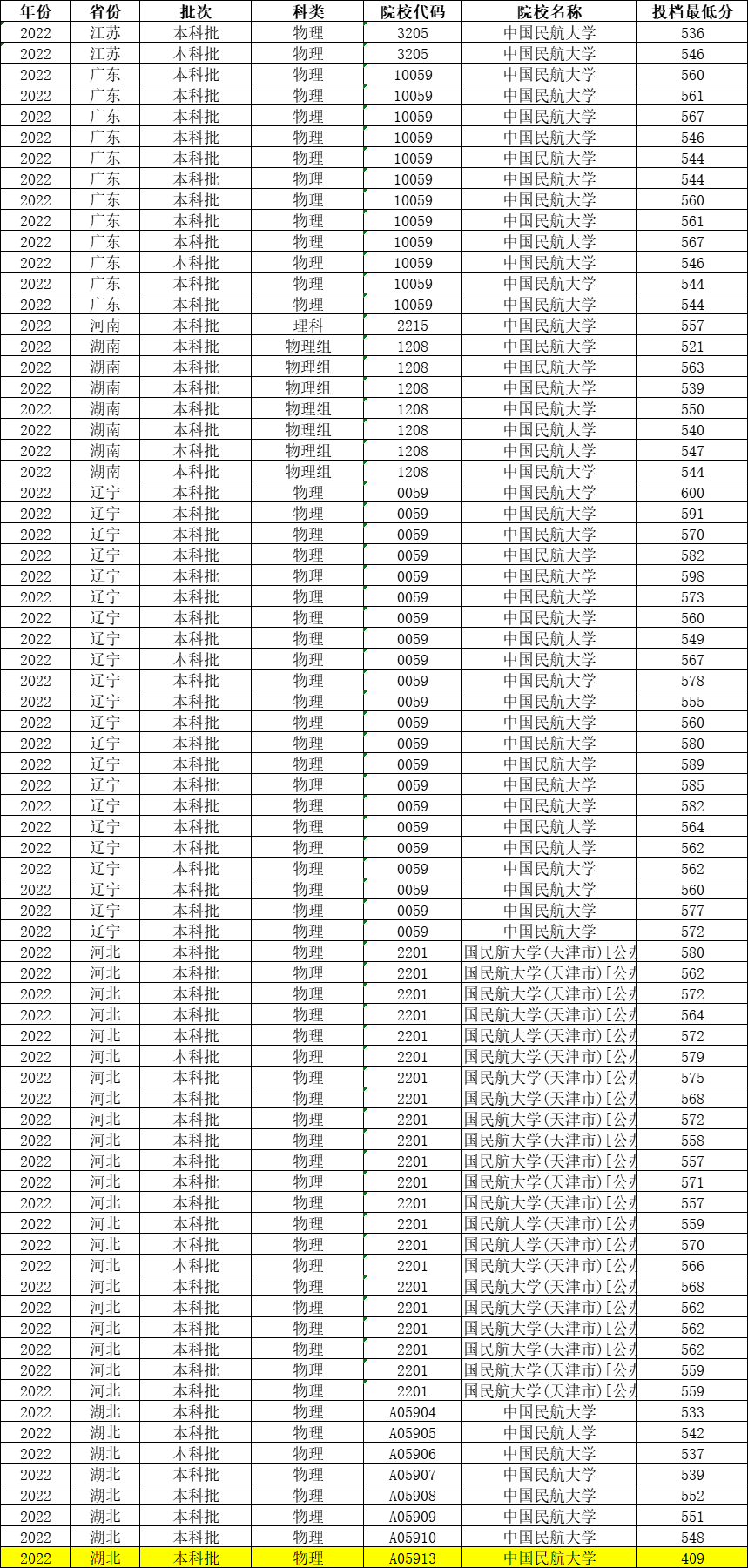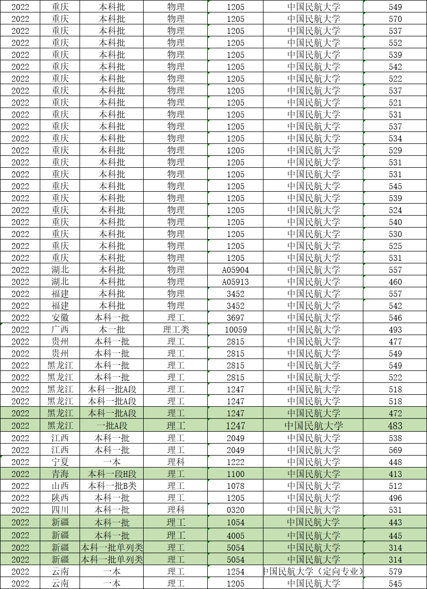 中国民航大学各省2022年最新理科/物理投档线数据: