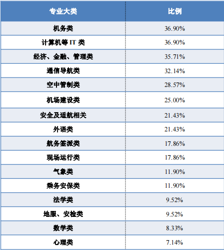 中国民航大学关于招聘专业意向的有关数据,比较有参考价值。根据该校2021年毕业生就业质量报告:用人单位调查结果显示,用人单位招聘 本校毕业生占比较大的专业大类有机务类(36.90%)、计算机等 IT 类(36.90%)、 经济、金融、管理类(35.71%)和通信导航类(32.14%)。此外,空中管制类 (28.57%)、机场建设类(25.00%)、安全及适航相关(21.43%)和外语类(21.43%) 亦占据不小的比例。