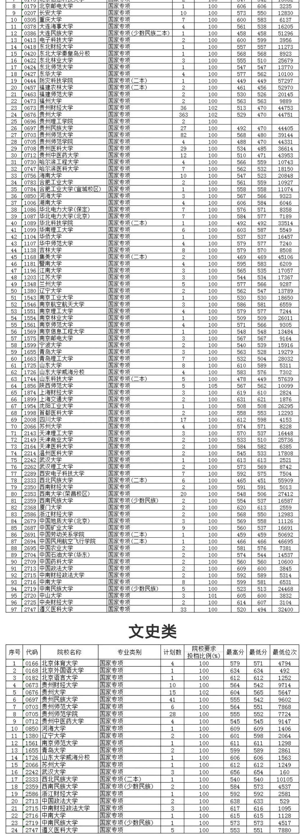 总体来看,贵州省的理科生补报其他省份本科高校比文科低。贵州大学对贵州理科生的录取最低分为470,最高分为529。文科生最低补报录取线为565,最高分为604,文理相差近80分左右