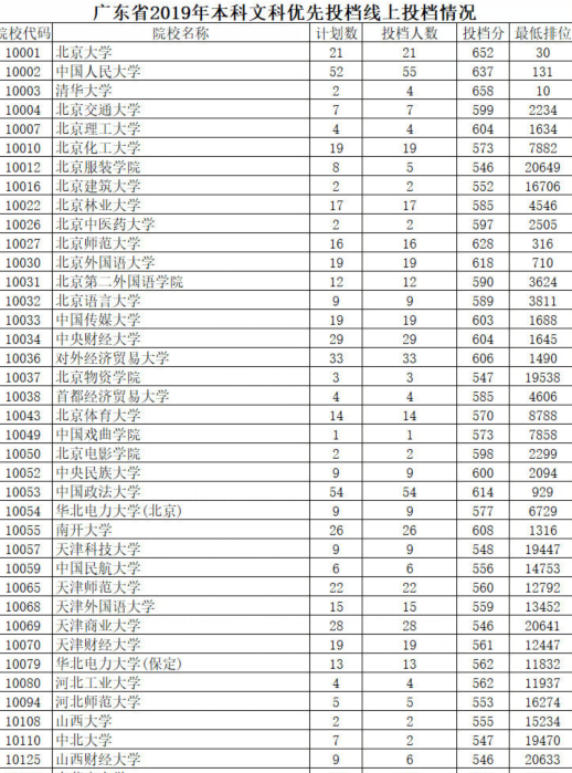 清华大学在广东的最低录取分数线为658分,北京大学在广东最低录取分数线为652分。投档清华大学人数居然只有4个,而北京大学有21个。