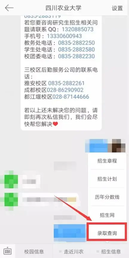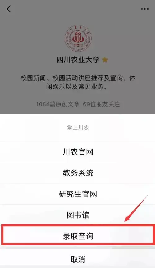 1 关注“四川农业大学”公众号,点击“掌上川农”菜单栏,最后一栏“录取查询”。