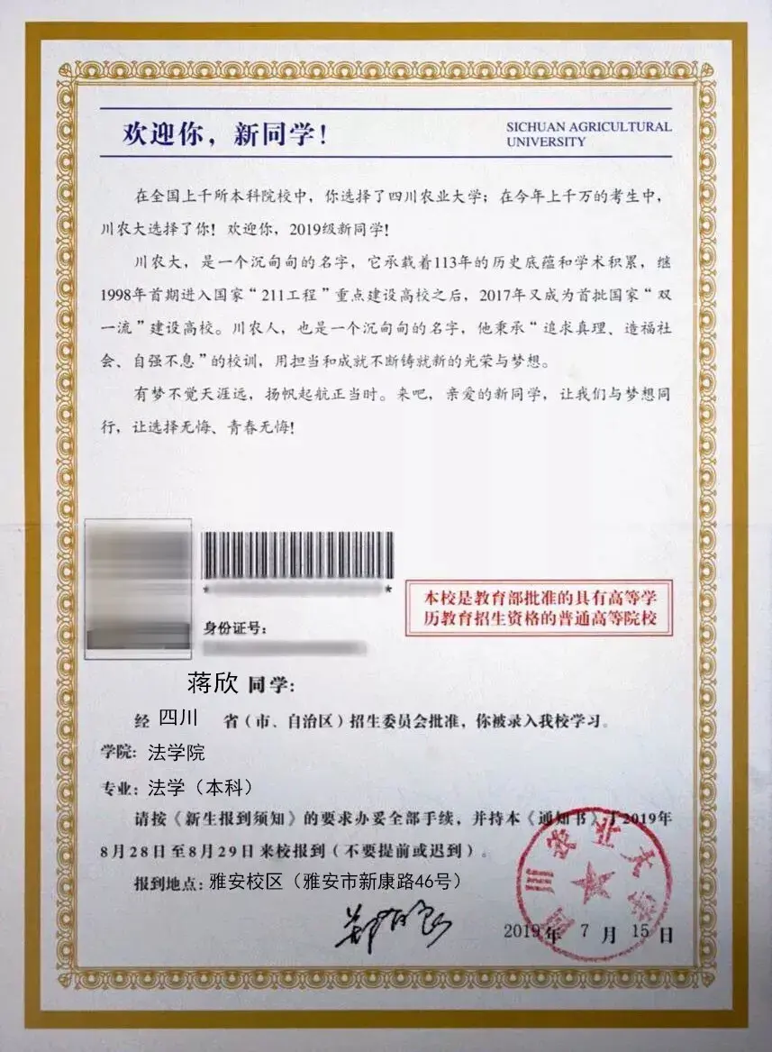 川农大录取通知书将五湖四海的我们联系在一起