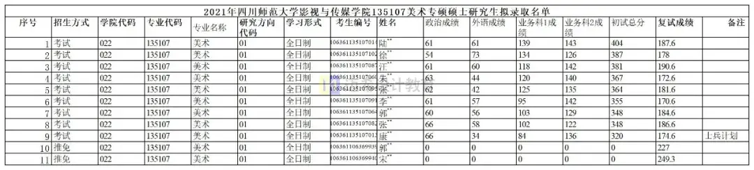 2021年影视与传媒学院135107美术专硕录取11人,含1名士兵计划,2名推免。一志愿录取8人,一志愿初试最低分348,初试最高分404。