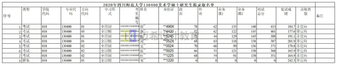 2020年美术学院·书法学院130400美术学录取8人,含1名推免。一志愿录取7人,一志愿初试最低分351,初试最高分413。美术教育录取4人,西南美术遗产录取3人,绘画录取1人初试401分。