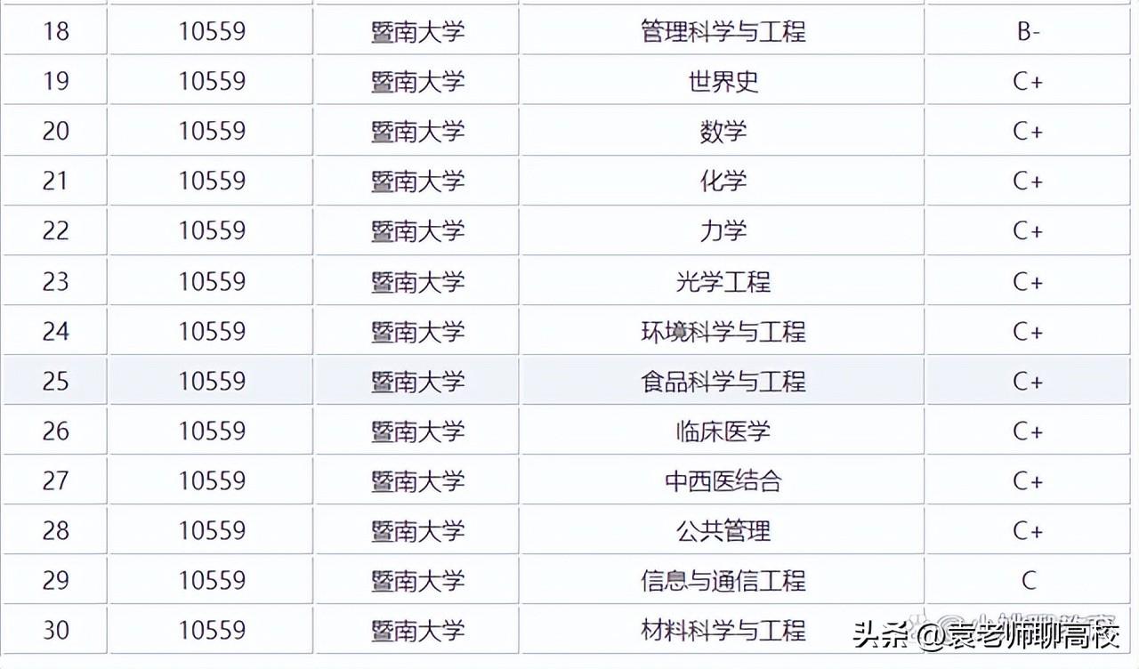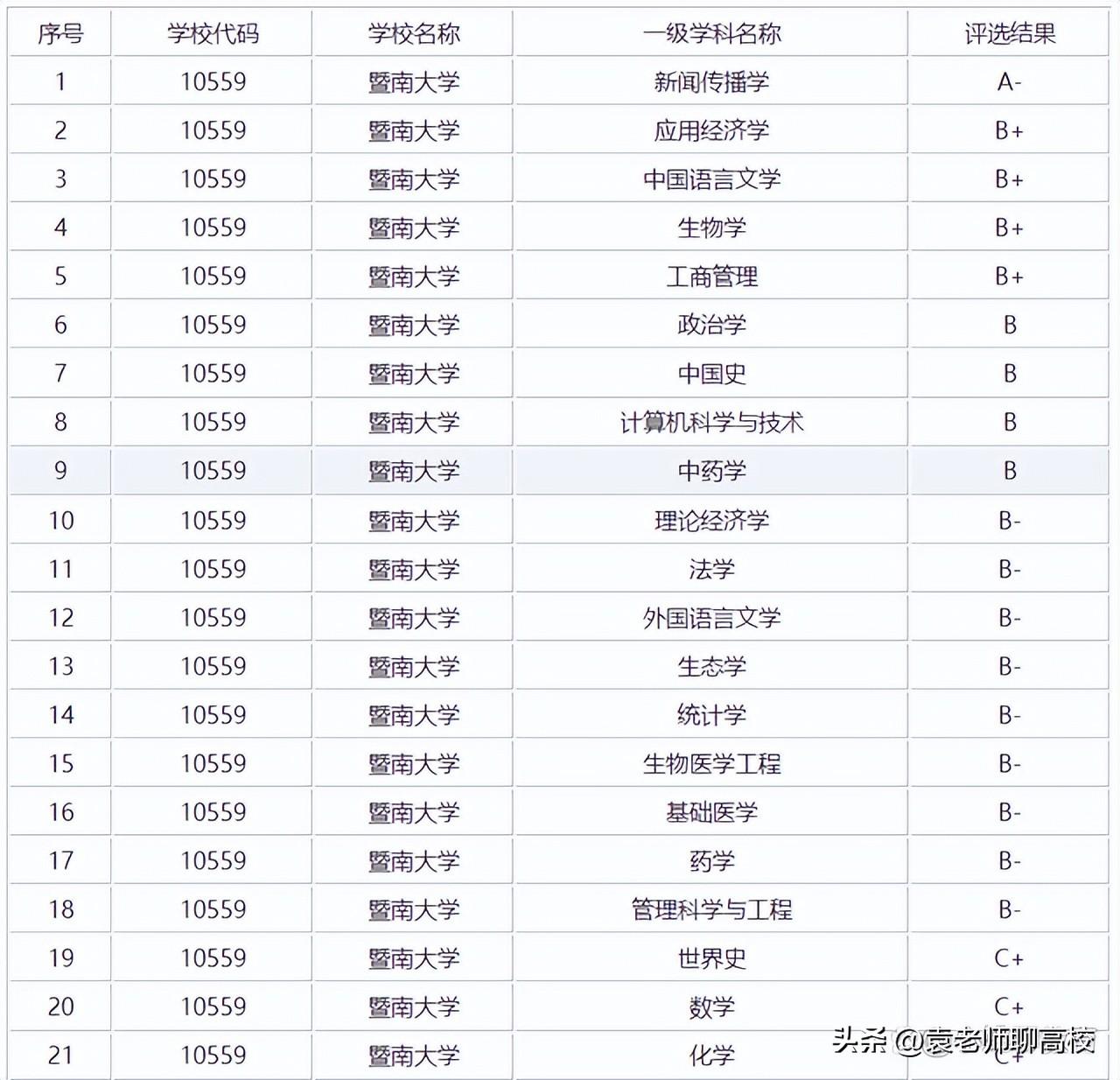 在第四轮学科评估中,暨南大学有30个学科上榜,其中最强的学科是新闻传播学,被评为A-,具体可见下图。