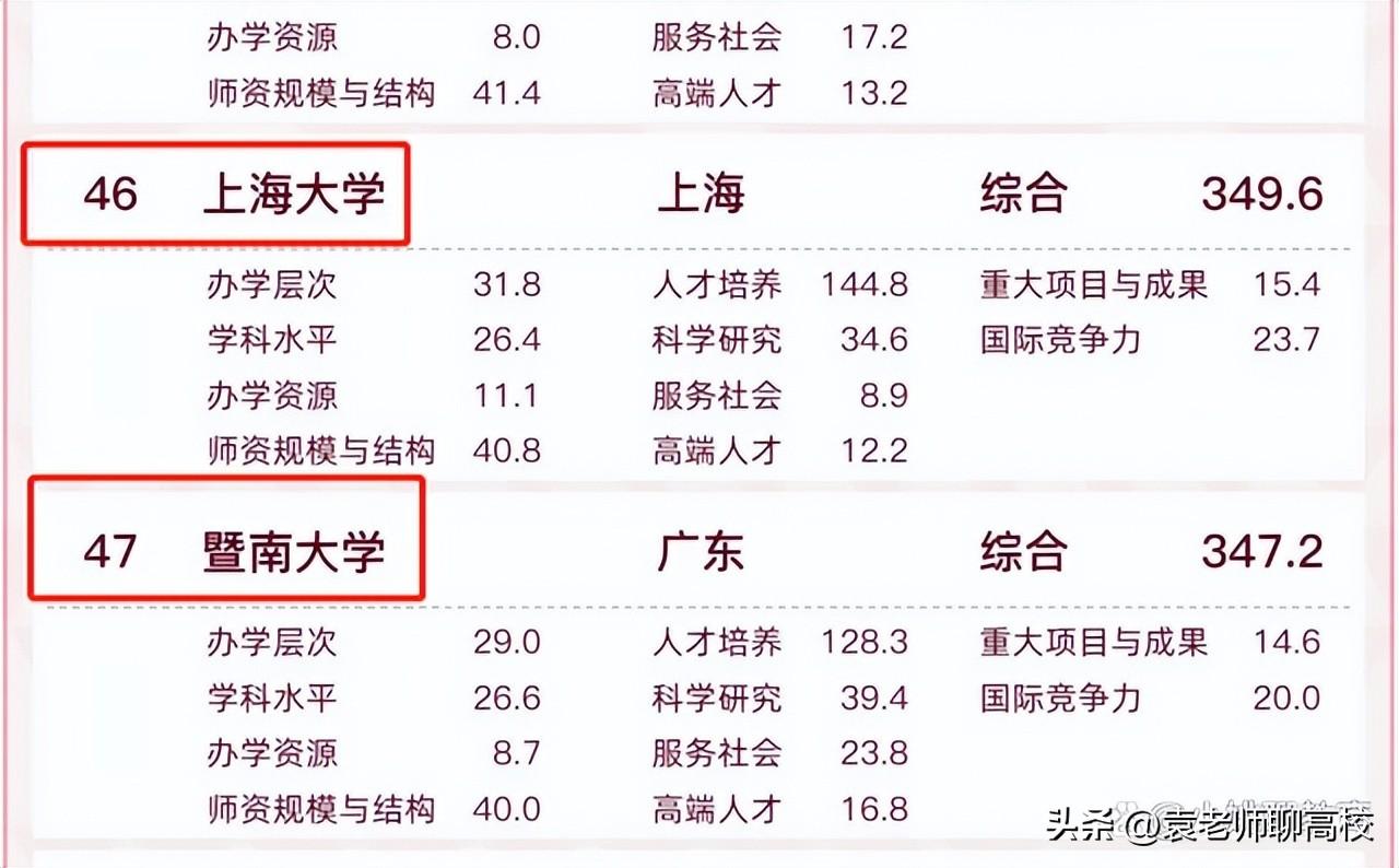 以2022年软科高校排名来看,上海大学位居全国第46位,暨南大学位居全国第47位,两校排名大致相当。