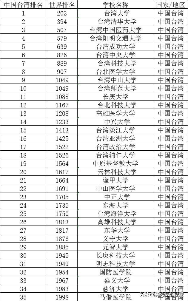 中国台湾也有台湾大学、台湾清华大学、台湾中国医药大学等八所大学入选前1000名。