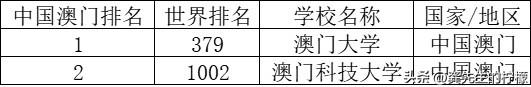 中国澳门有两所入选,澳门大学和澳门科技大学分列第379、1002。相对来说,澳门大学无论是在此榜还是在泰晤士、QS最新排名中均相对稳定,且名次较靠前。
