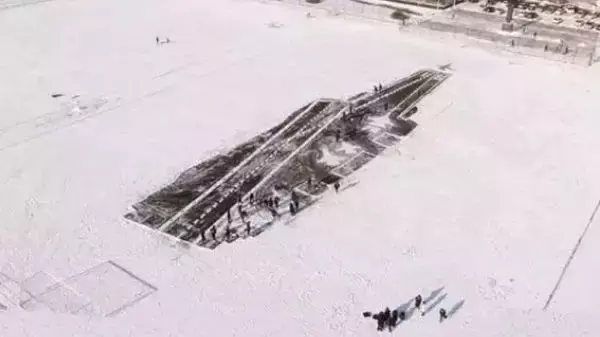 哈工程机电工程学院工业设计专业的学生们在军工操场上雪地画出了一个航母甲板的平面图