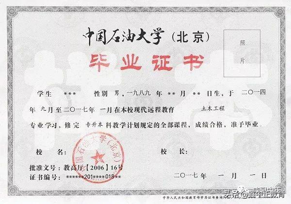 毕业证书:修满教学计划规定的必修课程,并且总学分不低于80学分,学习时间不少于两年半,通过教育部组织的公共基础课统一考试。毕业鉴定合格,由中国石油大学(北京)颁发毕业证书(国家承认学历),标注“现代远程教育”字样,并报教育部电子注册。