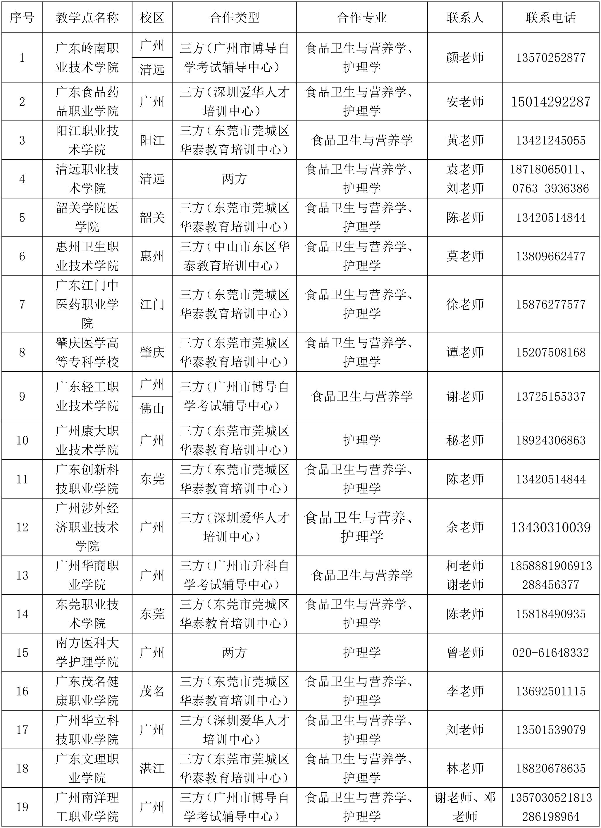 我校为广东省高等教育自学考试主考学校(学校代码:557),2007年开始开展自学考试工作,开设了食品卫生与营养学、护理学本科,食品营养与卫生、护理专科等专业,2022年我校拟设立19个相沟通助学点,分别是:广东岭南职业技术学院(含清远校区)、广东食品药品职业学院、阳江职业技术学院、清远职业技术学院、韶关学院医学院、惠州卫生职业技术学院、广东江门中医药职业学院、肇庆医学高等专科学校、广东轻工职业技术学院(含佛山校区)、广州康大职业技术学院、广州涉外经济职业技术学院、广州华商职业学院、东莞职业技术学院、南方医科大学护理学院、广东茂名健康职业学院、广州华立科技职业学院、广东创新科技职业学院、广东文理职业学院、广州南洋理工职业学院(自学考试合作助学单位及助学点以广东省自学考试委员会办公室年度文件通知为准)。