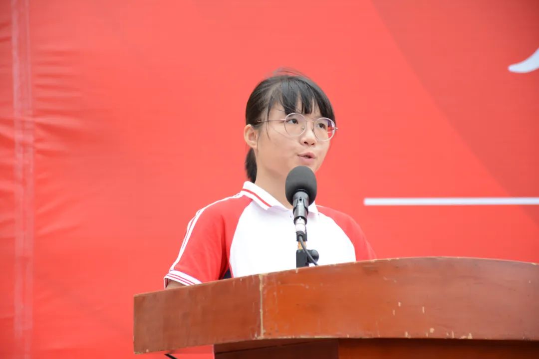 来自高三(7)班的学生代表谢宇婷同学在发言中回顾了两年来自己在一中的蜕变与成长,从腼腆到自信,从宅女到热爱自然、乐于交友。她呼吁高一、高二的学弟学妹们要有责任和担当,自觉把个人前途与民族复兴国家命运联系起来,常怀爱国之心、常思兴国之道、常念复兴之志,为实现“中国梦”贡献自己的力量。最后,谢宇婷勉励学弟学妹们要以青春的斗志和勤奋的双手实现梦想,创造奇迹,为一中争光,更为祖国添彩!