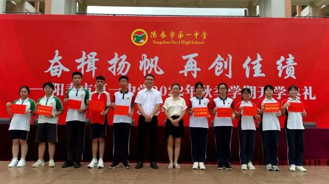 本次表彰的五万元奖金由阳春一中罗运青奖学金提供。阳江市洋兴实业有限公司代表叶晰恬女士、李敏先生与获奖学生合影留念。