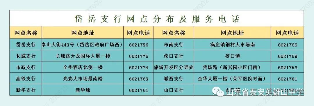高一新生办理银行卡说明泰安市教育局为进一步加强学校食品安全工作,保障学生身体健康,与中国农业银行泰安分行联合创建食品安全管理平台。我校为保证新生在校内消费时能安全使用校园卡,需每位新生家长(监护人)提前做好如下工作:1. 8月30日前家长带本人身份证、手机到农行岱岳支行任一网点办理银行卡及掌上银行。开户网点地址及联系电话附后。(初中阶段使用农行手机银行正常缴纳餐费的家长不用再办理)。已经开立农行卡及掌银的家长直接参照第3步充值即可。校园卡充值操作流程如下:学生报到,拿到校园卡后,第一步:登录农行掌上银行app第二步:生活 生活缴费 更多 校园卡 山东省泰安英雄山中学 输入饭卡账号、姓名、金额,输入银行卡密码,充值成功。