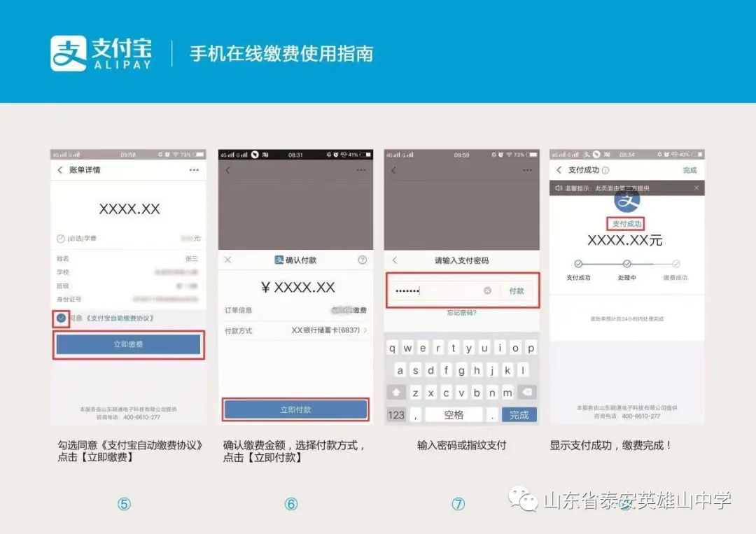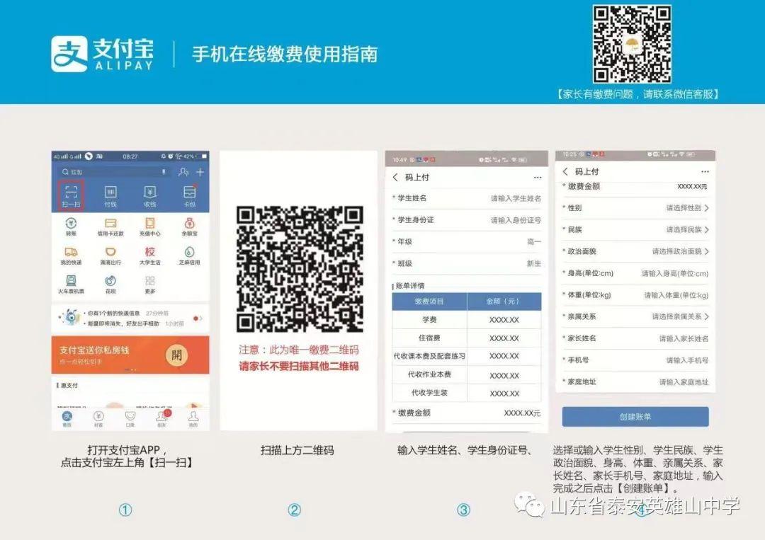 2022级新生报到须知亲爱的同学:你好!祝贺你在2022年中考中以优异成绩被山东省泰安英雄山中学录取,成为英中大家庭的一员。为保证你顺利入学,凡被我校录取的同学,在收到录取通知书和本须知后,按照要求完成交费注册和入校报到工作,现将我校2022级新生注册报到有关事项说明如下:一、交费注册1.应交费用:学费800元,住宿费260元,代收课本费2000元,代收作业本费20元,代收学生装(春秋装、冬装、夏装)费500元,共计3580元。(根据上级要求和疫情防控需要,原则上所有学生一律住校,代收费实行多退少补)2.交费方式:通过支付宝缴纳(具体操作详见附件:手机在线缴费使用指南)3.交费注册截止时间:2022年7月28日下午4:00前,逾期不缴费注册者,将取消入学资格。二、学校报到交费注册成功的同学,于2022年7月29--30日两天内,持录取通知书和准考证到校报到,并领取《泰安英雄山中学2022级入学须知》《泰安英雄山中学从严治校的十项规定》、部分高一新教材、初高中衔接学习资料等材料。在统招分数线以上的所有男生(已被全市自主招生蓝天班录取的学生除外)领取《蓝天班报名表》(自愿原则),在相关工作人员引导下参加体检面试(开学报到后,学校将择优组建一个蓝天创客班)。根据防疫需要,实行错时报到,具体报到安排如下:7月29日上午:马庄、汶口、房村、良庄、满庄、山口、北集坡;下午:夏张、菁华双语学校、道朗、化马湾、岱岳实验中学;7月30日上午:粥店、徂徕、角峪、范镇、祝阳、黄前、下港;下午:泰安英雄山中学初中部、英雄山双语学校、开元中学及其他7月31日上午: 各乡镇未报到同学报到,请各乡镇按照上述时间安排到校报到。时间:每天上午7:30-11:30 下午2:00-5:30 三、学校地点岱岳区英才街11号(岱岳区政府大楼正南2公里、高铁站南500米),可乘坐17、27、37、38、56、66路公交车到达学校附近。四、注意事项1.收到入学通知书后,请尽早注册,以防集中注册登录网络拥挤。2.报到时须严格遵守学校防疫的要求:(1)新生报到入校时,请提前一天将学生的健康码、行程卡用A4纸打印,交给校门口的工作人员。注意:健康码要点开姓名右边的眼睛图标,显示本人的完整姓名和身份证号码。