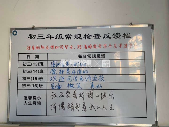 在教学楼二楼教师办公室门口,各位班主任手写温馨寄语送给前来的各位初三学生:“困难是一时的”“爱是永恒的”“欢迎同学老师返校”“见面、微笑、正好”…