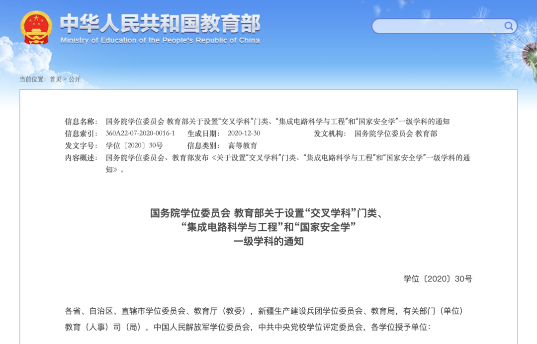 2020年,教育部官网发布《国务院学位委员会 教育部关于设置“交叉学科”门类、“集成电路科学与工程”和“国家安全学”一级学科的通知》。