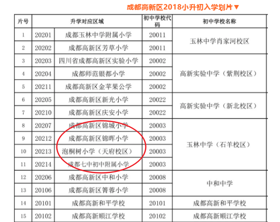 成都市招生考试委员会办公室官网发布的“成都高新区2019年小学毕业生初中入学划片范围”: