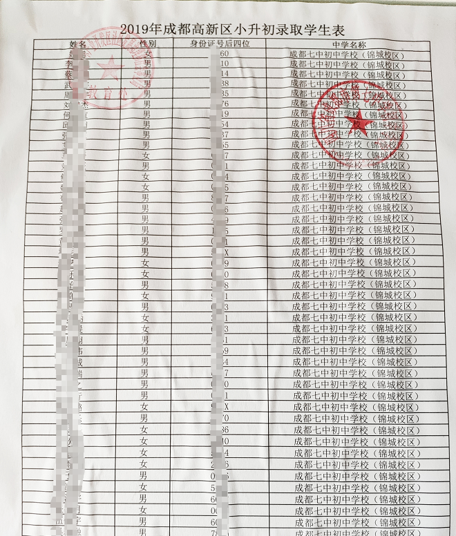 另一边,还张贴了一张2019年成都高新区小升初录取学生表,录取学校当然也就是“成都七中初中学校(锦城校区)”