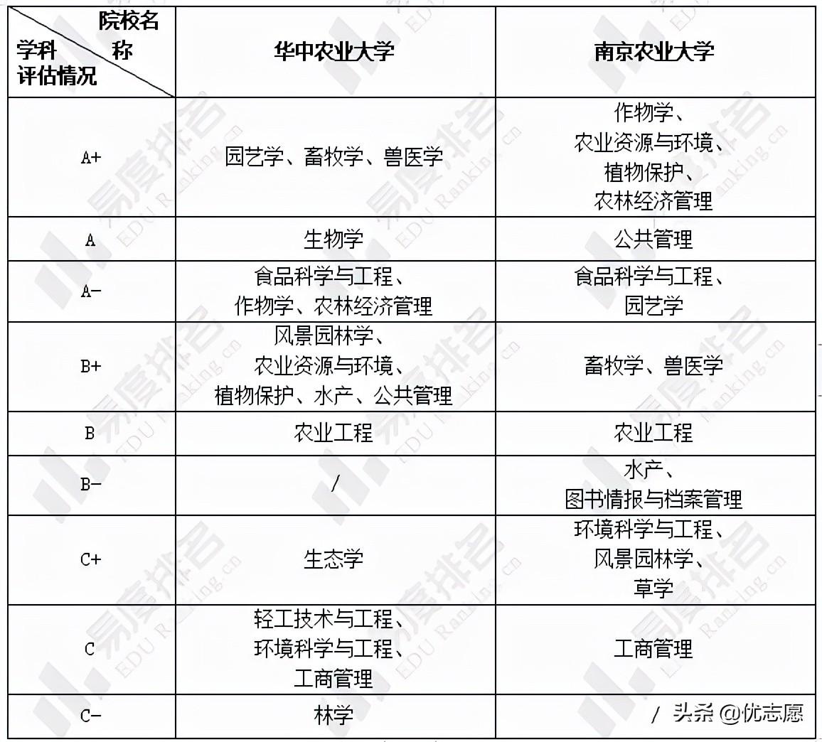 根据第四轮学科评估,华中农业大学有18个学科参评,南京农业大学有16个学科参评,两校评估为A类(A-及以上)学科数量相等,南京农业大学评估为A+的学科数量较多。整体来看,两校学科实力不分上下,华中农业大学的园艺学、畜牧学、兽医学等学科实力较强,南京农业大学的作物学、农业资源与环境、植物保护、农林经济管理等学科实力较强。