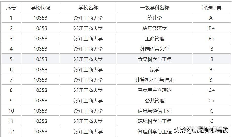 浙江工商大学在第四轮学科评估中,有12个学科上榜,其中最好的学科是统计学,被评为A-,应用经济学和工商管理等两个学科被评为B+,具体可见下图。