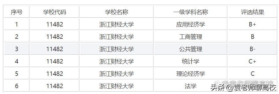 浙江财经大学在第四轮学科评估中,有6个学科上榜,其中最好的学科是应用经济学,被评为B+,工商管理被评为B,具体可见下图。