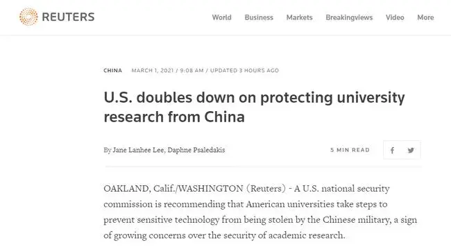 西方四大通讯社之一的路透社报道了一则新闻:美国国家安全委员会已经向美国国会提交了一份所谓的《安全报告》,报告中建议美国的大学应该采取相应措施,方式中国的学者窃取敏感的科学技术。话里话外,透着浓浓的“防盗”意味。