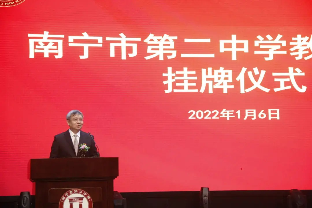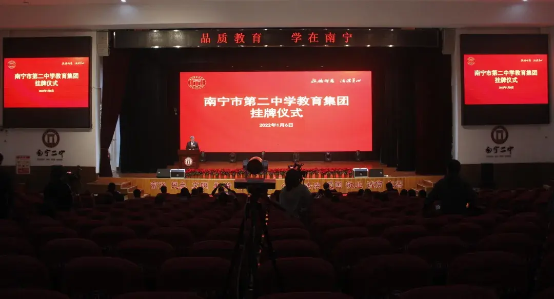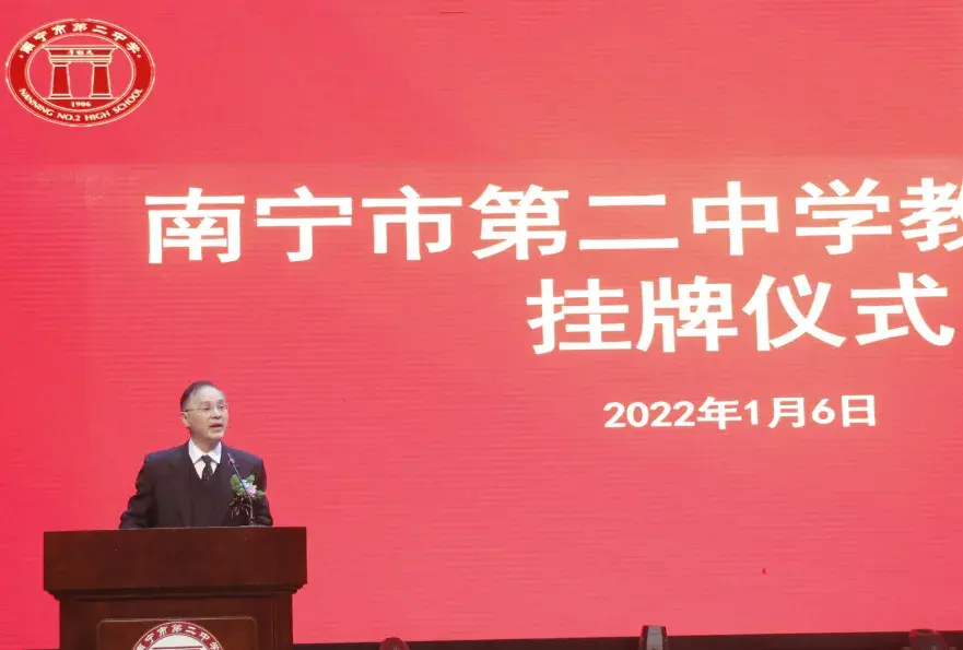 为深化教育体制机制改革,充分发挥广西省南宁市优质教育资源的引领和辐射作用,扩大优质教育资源覆盖面,大力促进教育公平,推动教育优质均衡发展,扎实推进集团化办学工作,2022年1月6日,广西省南宁市第二中学教育集团正式挂牌成立。市委教育工委书记,市教育局党组书记、局长汪述斌出席仪式并致辞;市委教育工委委员、市教育局党组成员、副局长章志宏,南宁二中校长黄幼岩、党委书记徐华参加挂牌仪式。