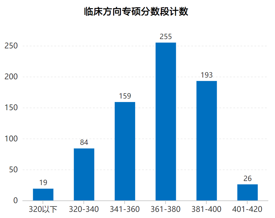 临床专硕:除非全日制和定向培养外,共录取736人,定向培养9人,最高分为415分,报考外科学(普外科);最低分为310分,报考的也是外科学(外科)。大部分考生分数段趋于361-400分之间。