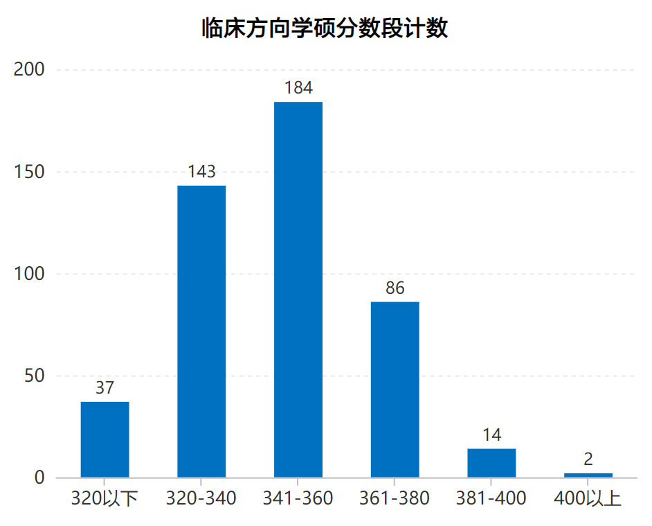 临床学硕:共录取466人,除特殊政策外,最高分为403分,报考外科学(胸外科);最低分为309分,报考精神病与精神卫生学(精神医学科)、肿瘤学、儿科学(儿内科)、老年医学(老年医学科)、外科学(骨外科)这几个专业。大部分考生分数段趋于320-360分之间。