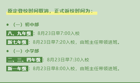 原计划8月23日学生登校,8:00准时到校,15:30放学。(按长春市教育局统一要求,如有变动另行通知。)