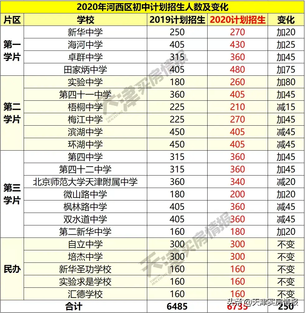 今年招生范围还是公办本片区、民办全区,但公办民办志愿填报和录取合并在一轮进行,学生最多可以填“3所公办+3所民办”6个志愿,录取遵循志愿优先原则,公民同招,鱼和熊掌必须取舍了。往年想进民办,小升初毕业考试成绩是最重要的决定因素,今年民办初中则不再参考任何成绩,同公办初中一样摇号录取,也就是说不管成绩好赖,只要填了志愿,录取机会是一样的。如果学生第一轮的六个志愿均未被录取,有剩余招生计划的学校将会调整招生名额,意味着本片区内有剩余人数的公办初中都有可能被分配到。另外从计划招生数量上来看,2020年河西区招生计划总数比去年多了250人,增量变化主要来自第一学区片,民办校计划招生人数则均不变。