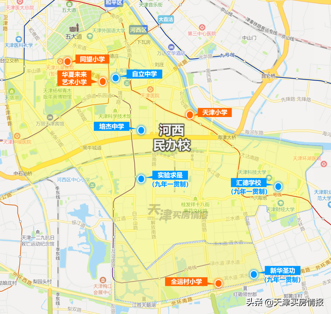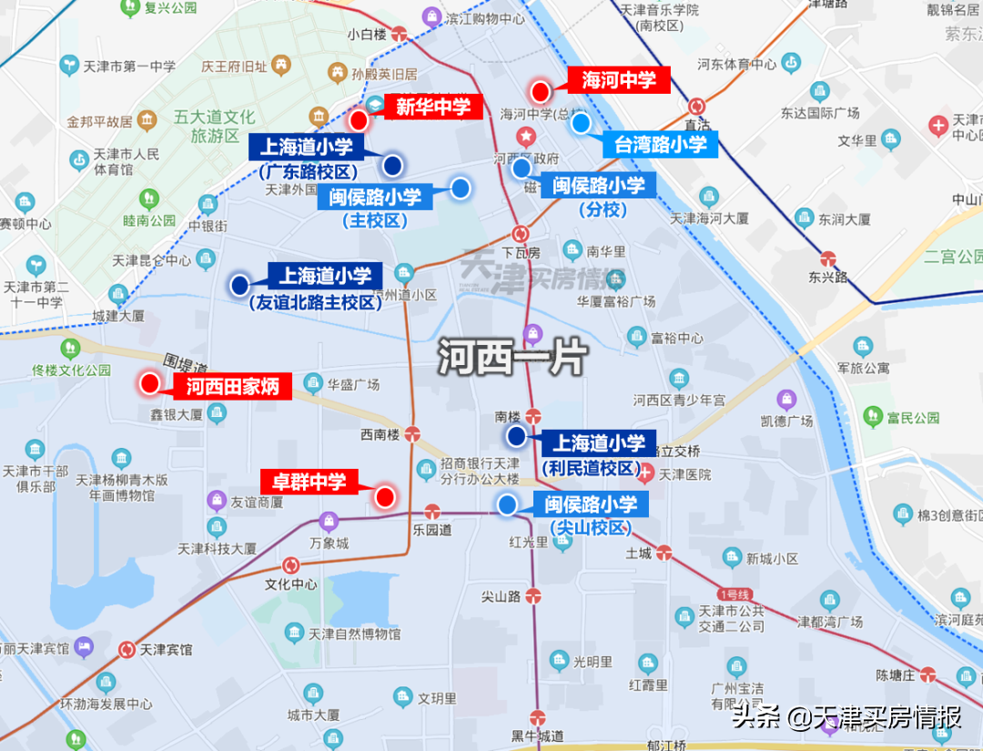 河西区的小学、初中资源都属高配置,重点公立校、私立校并重,金字招牌很多,优质学校的数量和含金量仅次于和平,整体比南开还要强一些。