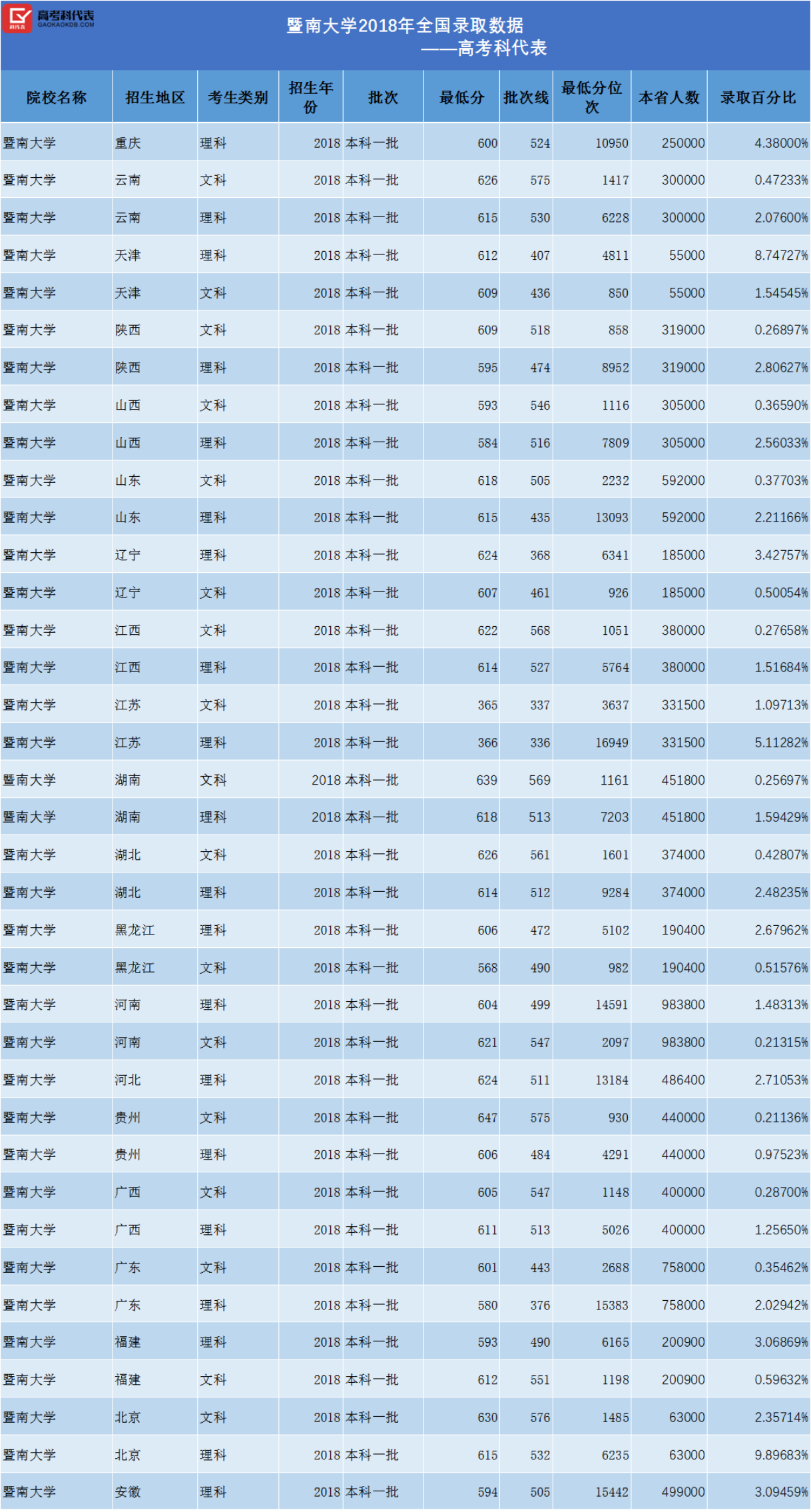 下面是暨南2018年在各省的录取分数,我们可以从下表中找一下各自省份的录取分数,以作为自己报考暨南大学的依据,各省无论文理科,基本达到600分以上,毕竟好城市、好专业和好学校的吸引力还是非常具有吸引力的。