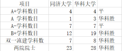 由表可知,华中科技大学的计算机学科评估等级为A,同济大学的计算机学科评估等级为A-。看似只差一个等级,看排序知差了6名。