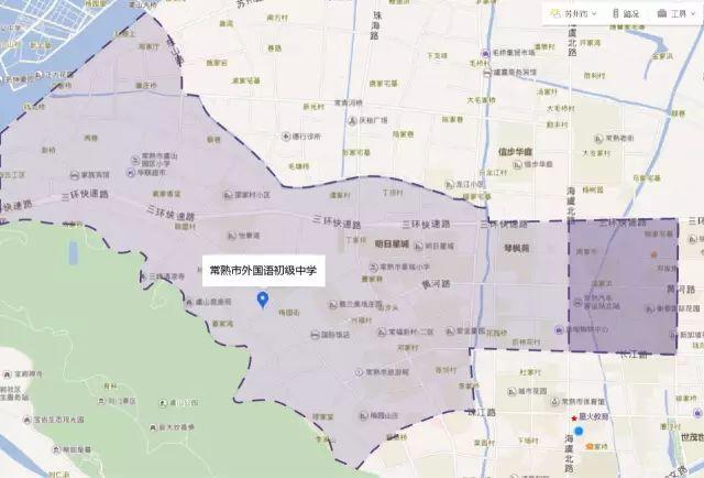 (1.东至海虞北路,南至常浒河延至泰安桥,西至福山塘至环城北路转鸭潭湾至泰安桥,北至珠江路区域为实验中学湘江路校区与常熟市第一中学共同学区;2.新世纪大道以西,北三环以南、泰山路以东、长江路以北区域为常熟市实验中学昭文路校区和实验中学崇文校区共同学区;3.泰山路以西、北三环以南、海虞北路以东、长江路以北区域为外国语初级中学和实验中学崇文校区共同学区)