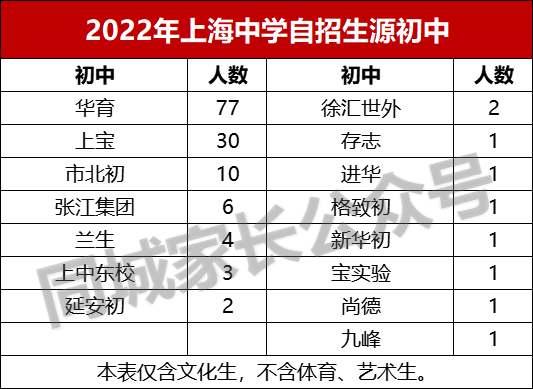 2022年,上海中学预录取共141人,根据“G大成长论”统计,生源校来自15所初中,其中华育、上宝两校占比最高,分别是77人、30人。