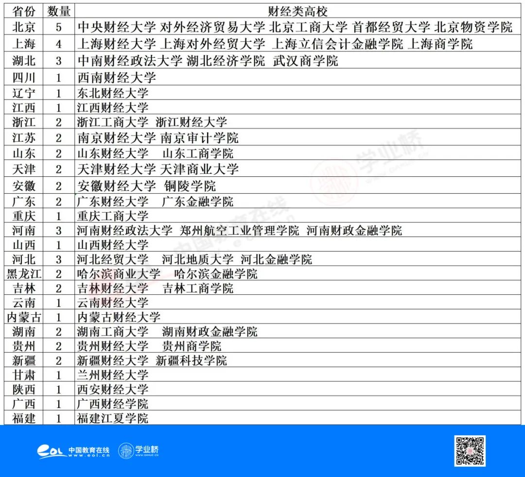 参照上海软科2021年中国财经类大学的排行榜,全国财经类高校共51所。分布在全国27个省份。其中北京5所和上海4所分列前两位。具体情况见下表。