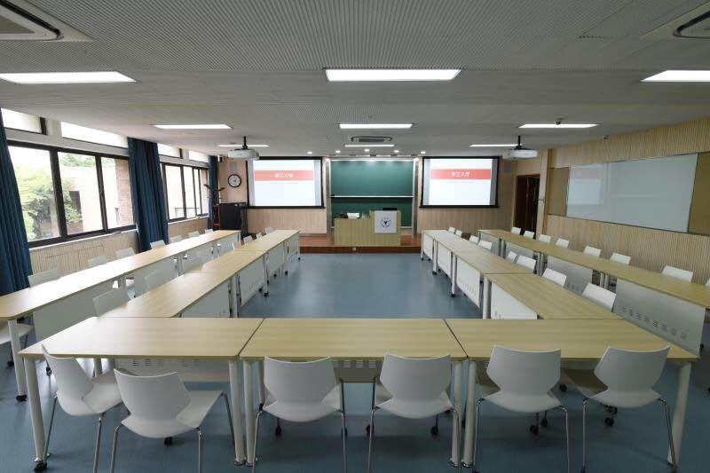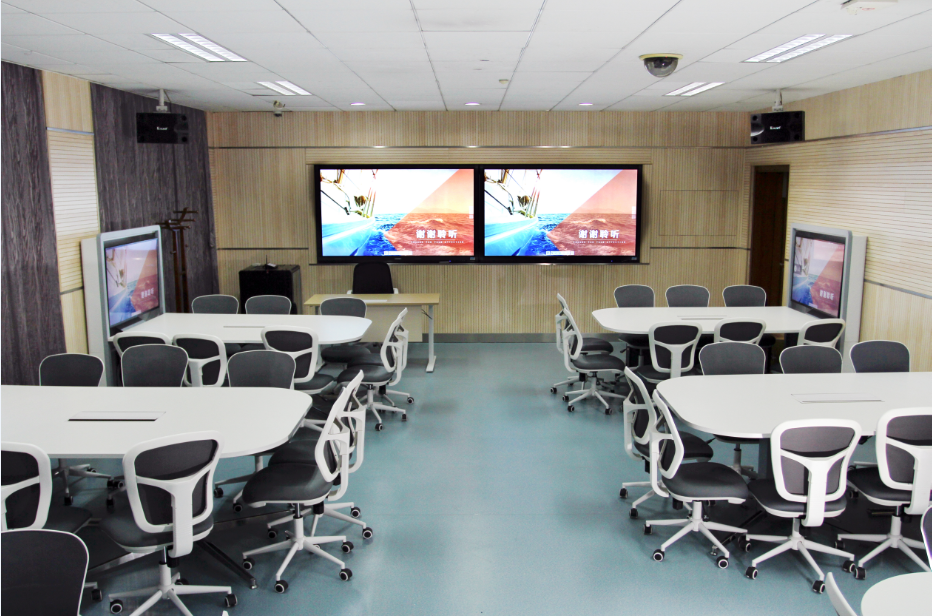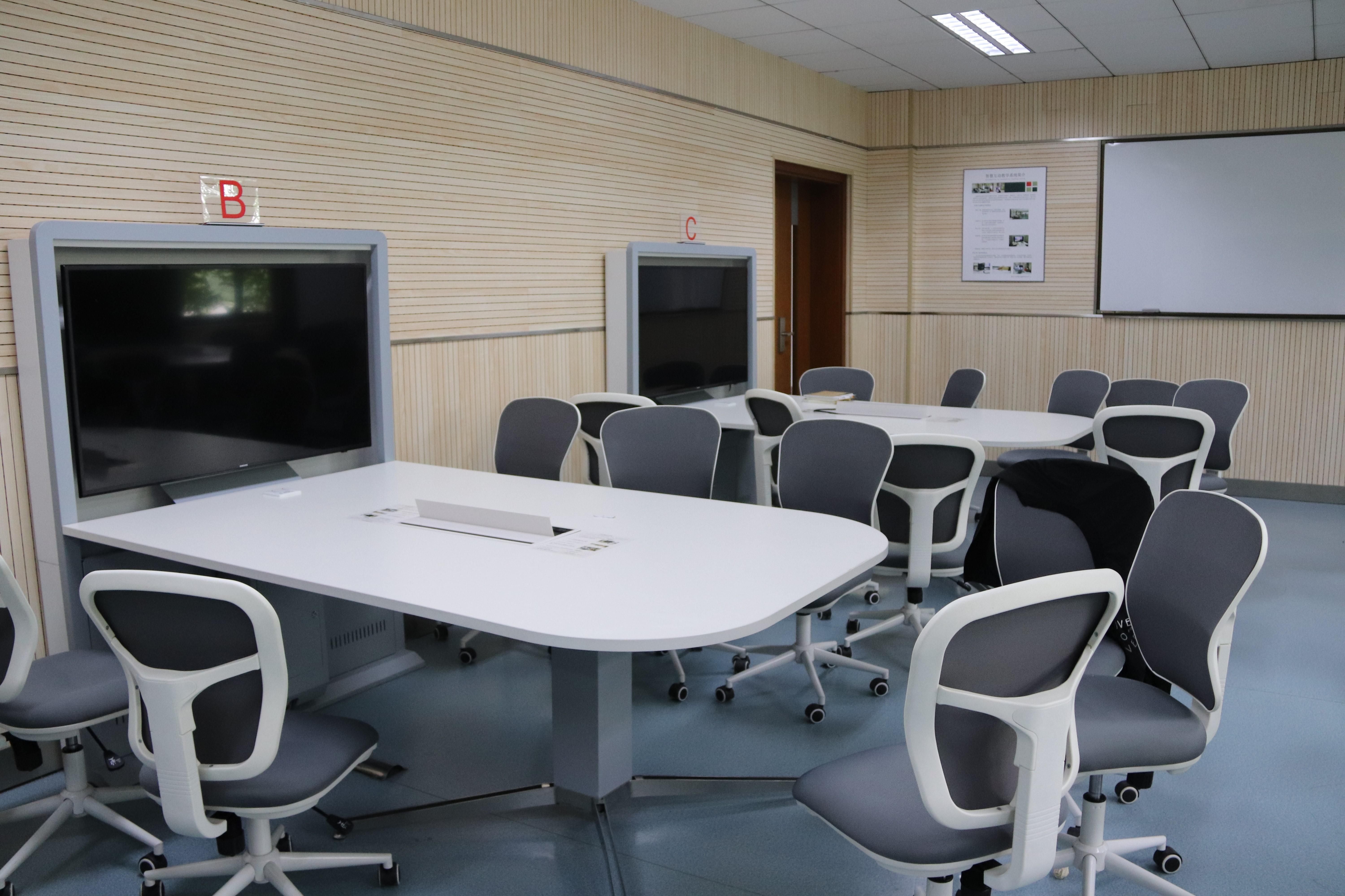 与203教室面对面的204教室,是配置更高端的远程互动教室。它配备价值近百万的多媒体教室设备,包括自动录播设备、直播转播设备和视频会议终端等。通过教室录像和系统传输,可以与远在千里之外的其他课堂进行视音频和电脑信号的实时交互。教室内同样配备了可移动的课桌椅,老师和同学们可以根据授课的需求排列组合成不同的形状。