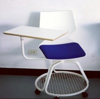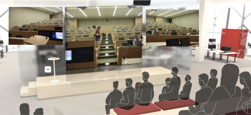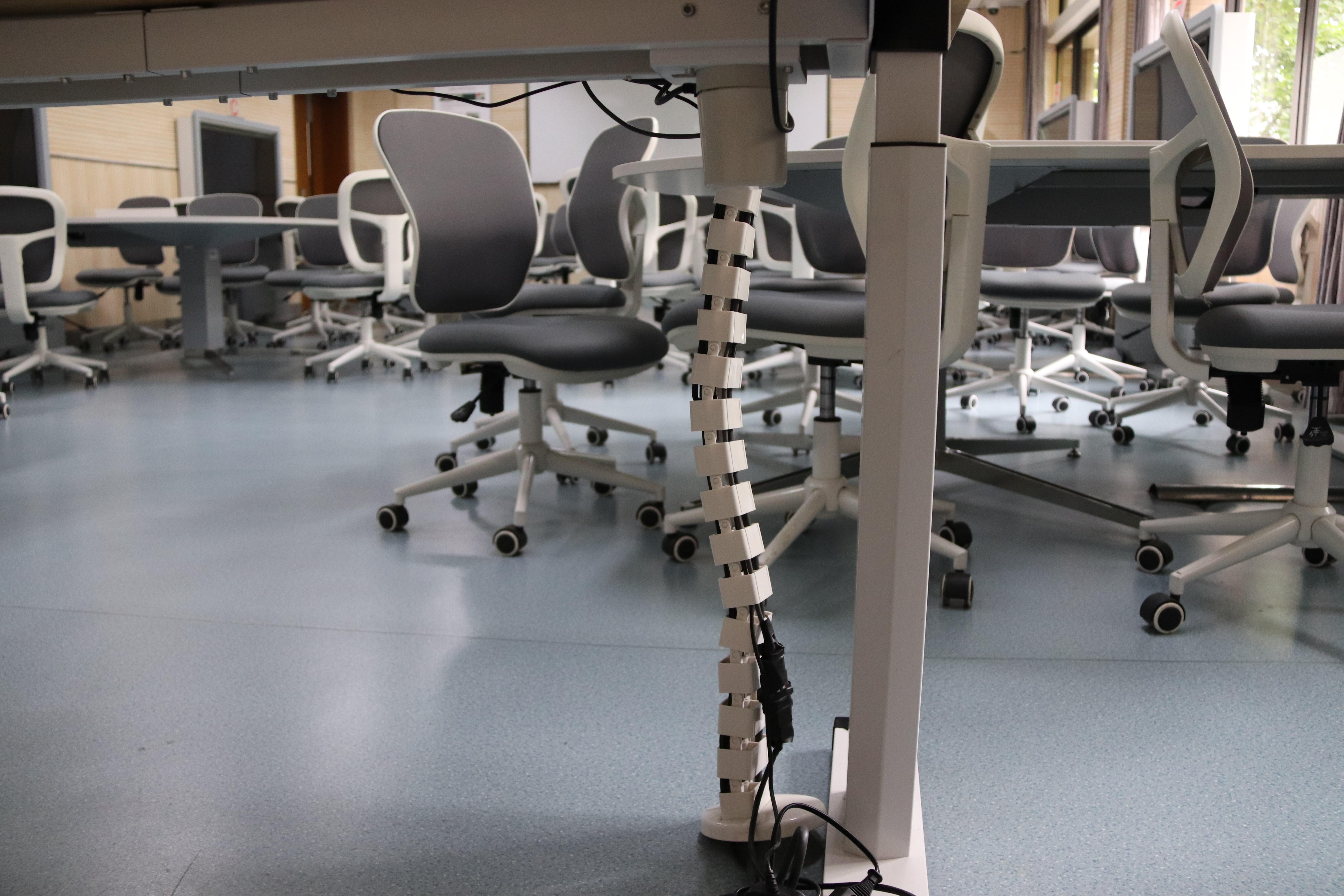 一方讲台,多处窍门。考虑到讨论课的性质,西1-201教室的讲台“脚踩风火轮”,被设计成可移动的形式,适用于不同形状的课堂布局;为了照顾不同身高老师的讲课需求,西1-203教室的讲台则增加了高度可调节的功能;在以远程互动为特征的西1-204教室,讲台固定且有高低之分,高位区安装着一台可升降的电脑,不使用时隐藏于桌面之中,使用时自动升起,低位区则是幻灯投影。
