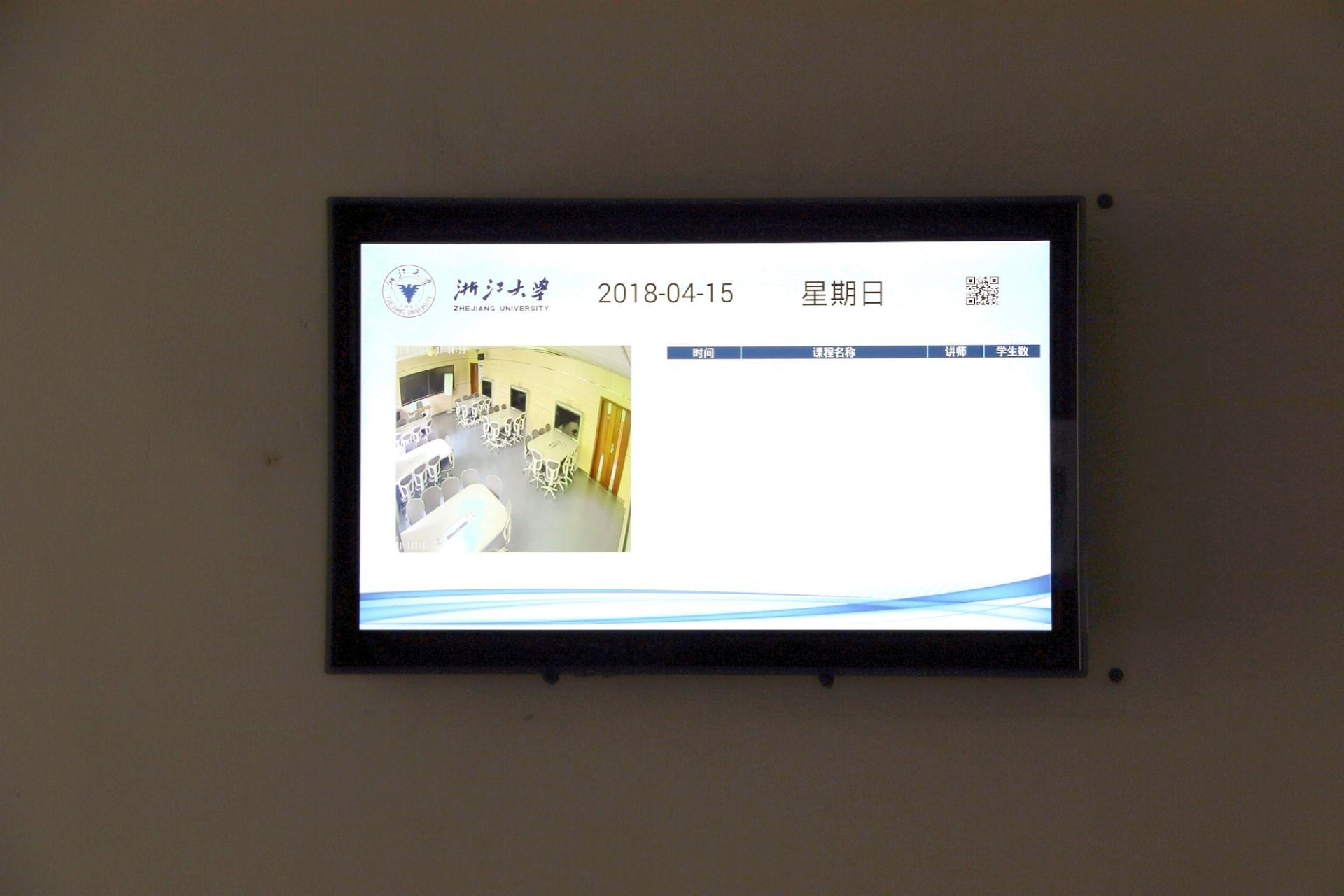 一块屏幕,全天服务。许多细心的同学已经发现,在教学楼的不少教室门口多了一块显示屏。信息技术中心教学支持部张宇燕介绍:“这块信息屏主要用于显示当日的课程信息、课程介绍、教师介绍,教室内的环境参数,如温度、湿度等,还能显示教室内的实景视频。”未来,这块屏幕还将实现更多的功能,譬如屏幕上显示的二维码将支持教室预约,更有效地提高教室的利用率,还可以帮助师生对该教室出现的故障实现故障报修等。
