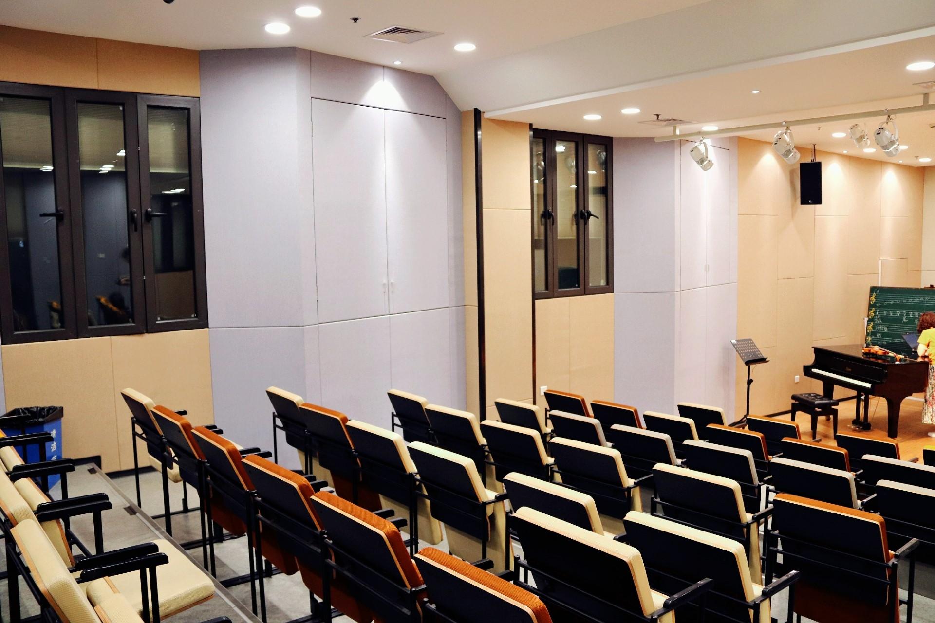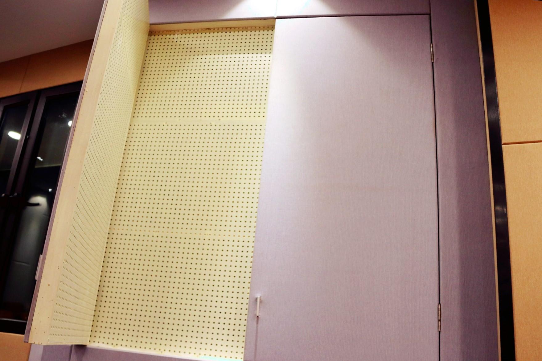 音乐教室,暗藏玄机。有钢琴和音响不算稀奇,但西1-105的隔音墙设计在国内高校并不多见。当内墙体被缓缓打开,“暗格”吸音板便呈现出来。周聪介绍,当内墙体合上的时候,延音多,声音混响效果强;而当内墙体打开的时候,在吸音板的作用下延音减少,声音会显得更干净、更清晰。如此“随机应变”的墙体设计可适应各种声音的环境。此外,教室外墙体经过加厚处理,加上嵌在其中的双层玻璃保证了即使站在窗外也无法听见教室内的声音。而被周聪称为“声闸”的两重门,是即使逃出第一扇门的声音也会被第二扇更厚的门拦在教室内,保证了附近教室内上课的同学不会被这里的乐声所打扰。